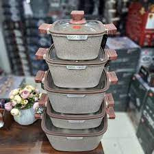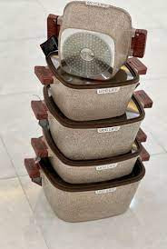 طرح دستهها ؛ طرح چوب و کامل نسوز جنس روکش.قابلمه ؛ سوپر گرانیت ضد خش و نچسب بودن صددرصدی اصل آلمان سایز قابلمه ها : ۳۲ ،۲۸, ۲۴, ۲۰ دارای ؛ یک عدد تابه ۲۸ درب دار