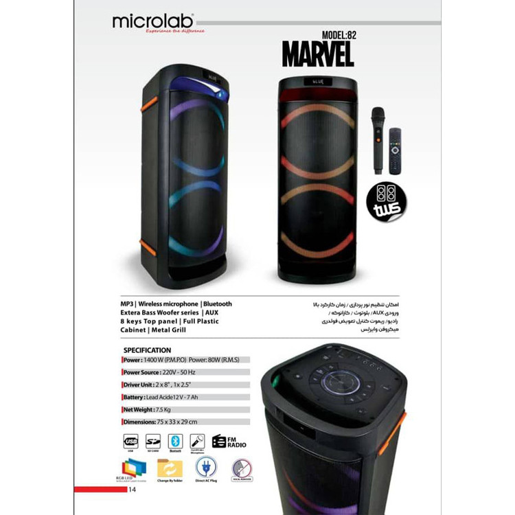 مشخصات ابعاد 290×330×730 میلیمتر ظرفیت باتری 70 میلیآمپرساعت میکروفون یک عدد 3.5 میلی متری رابطها جک 2.5 میلی متری صدا,پورت USB,AUX قابلیتهای اسپیکر ریموت کنترل وزن هر ستلایت (تکه) 7 گرم مدت زمان شارژ 7 مدت زمان پخش 7 توان خروجی اسپیکر 80 وات اقلام همراه بلندگو میکروفون بیسیم، ریموت کنترل، کابل برق توان خروجی 80 وات تعداد اجزاء سابووفر 2 عدد تعداد اجزاء اسپیکر 1 عدد توان ورودی 80 وات قطر بلندگو 200 میلی متر نوع باتری لیتیومی درگاهها و فناوریهای ارتباطی USB - یو اس بی حداکثر برد بلندگو 40 متر متر