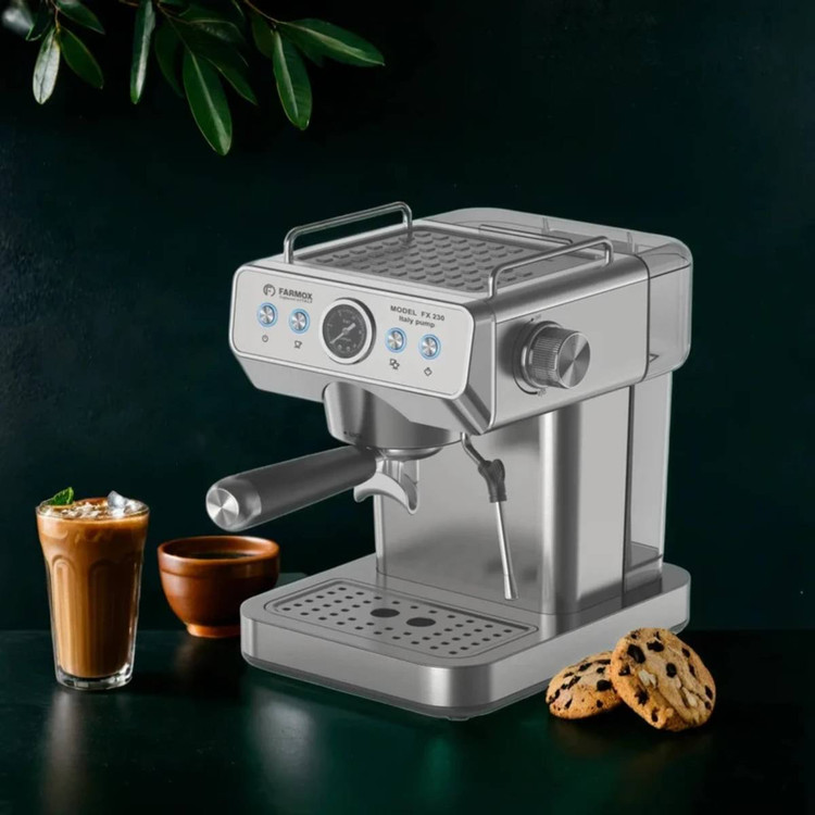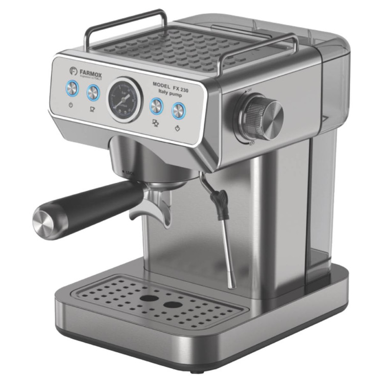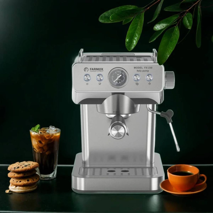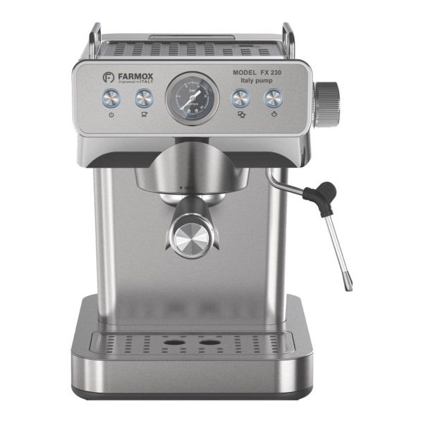 اسپرسو ساز فارموکس مدل FX230 با قدرتی معادل 1360 وات وتوان بخار 20 بار و همچنین توان خامه زنی تا 75٪، دارای بدنه تمام استیل ضد زنگ است ، و همینطور دارای پمپ ایتالیای با کیفیت ، یک دسته پورتافیلتر المنیوم حرفه ای ، و یک صفحه کاپ وارمر ، میباشد ، که در طعم عطر قهوه خروجی بسیار تاثیرمثبت دارد ، این دستگاه دارای یک عقربه فشار سنج میباشد ، مدل FX230 فارموکس مناسب برای استفاده در منزل و همچنین فضاهای کاری و غیره است ، و به عنوان یک اسپرسو ساز نیمه حرفه ای میتوانید نیاز شما را کاملا برطرف کند ، این وسیله دارای نازل بخار المنیومی با سری پیچی است، که برای ساخت کاپوچینو و لاته و هات چاکلت ،کاپیوچینو ، موکا، فلت وایت ، شیر داغ ، و …. کاربرد دارد