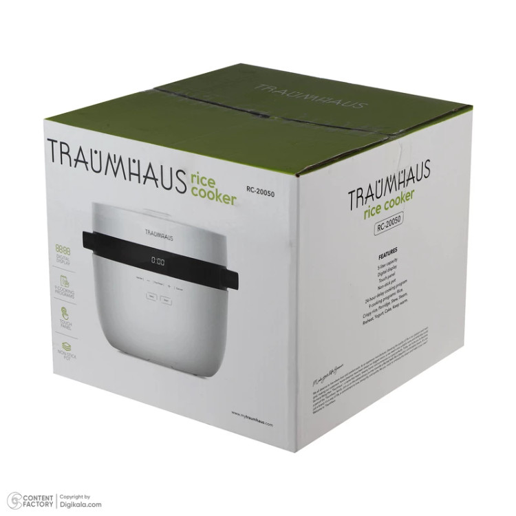 پلوپز دیجیتالی لمسی ترام هاوس مدل20050 ظرفیت 5 لیتر برنامه پخت تاخیری تا 24 ساعت دارای برنامه های غذایی شامل: برنج،ته دیگ،فرنی(پوره)،سوپ،بخارپز،گرم کردن،ماست و کیک دارای سبد بخارپز،پیمانه برنج،کفگیر و ملاقه رنگ سفید