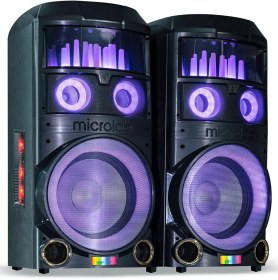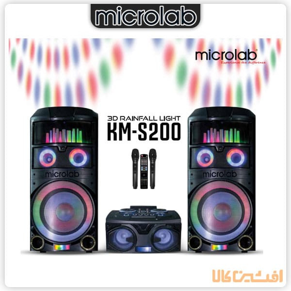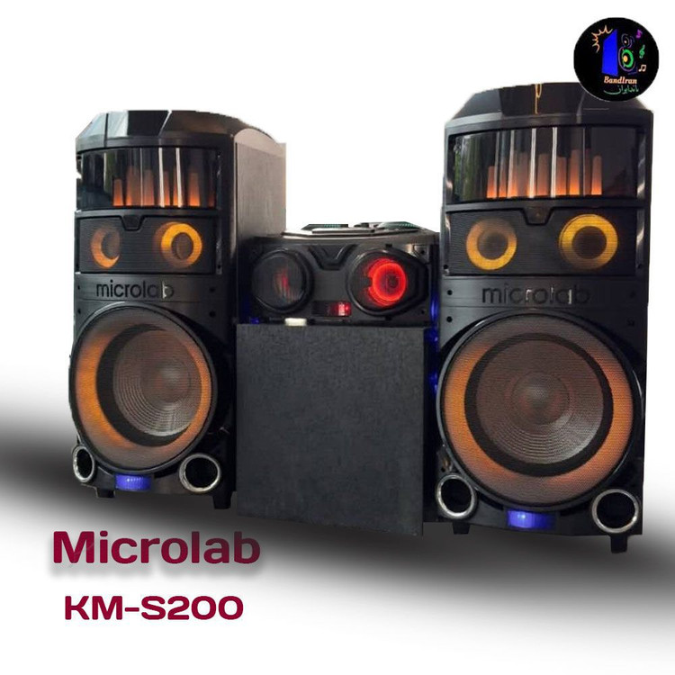 اسپیکر میکرولب مدل KM-S200 در رنگ کروم (Chrome) و گلد یک اسپیکر خانگی با طراحی جذاب و امکانات متنوع است. این اسپیکر دارای دو ساب ووفر 12 اینچی، آمپلی فایر مجزا، و توان خروجی 2400 وات P.M.P.O یا 110×2 وات RMS است. همچنین، دارای بلوتوث نسخه 5.0، اپلیکیشن هوشمند برای تنظیم نور و صدا، 3 ورودی AUX، ورودی SD card، کارائوکه، رادیو، ریموت کنترل و دو عدد میکروفون وایرلس با نمایشگر دیجیتال است. ابعاد این اسپیکر 85x40x33 سانتیمتر و وزن آن 36 کیلوگرم است.